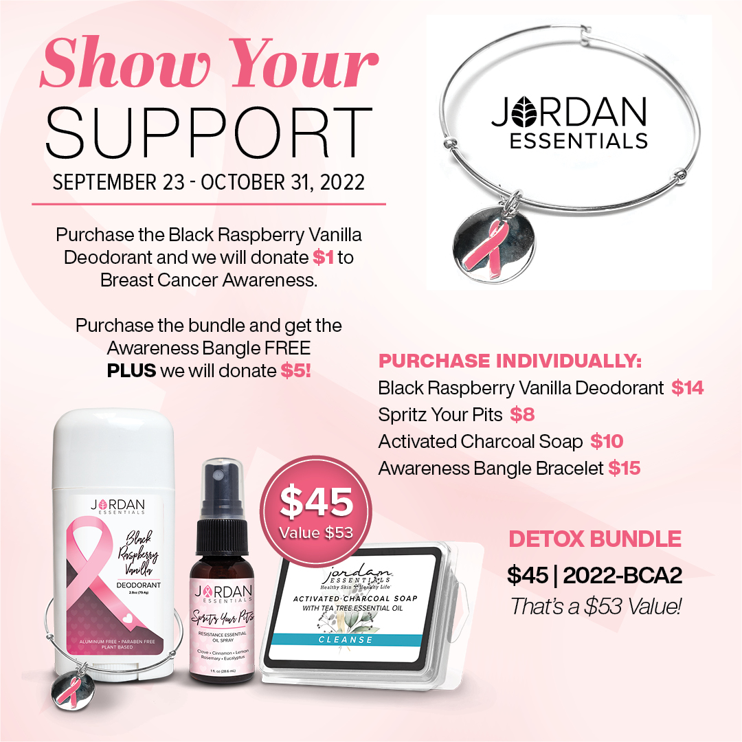During the month of October, Jordan Essentials is committed to doing our part. $1 from every purchase of our Black Raspberry Vanilla Deodorant and $5 from each purchase of our Detox Bundle will be donated to Breast Cancer Awareness.